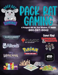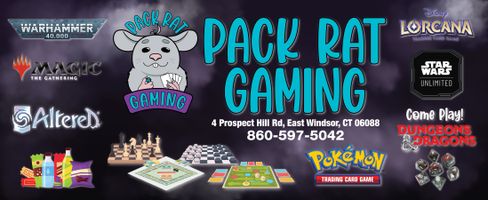 Pack Rat Gaming is an LGS in East Windsor, CT offering playspace, events, and products for all your favorite card, tabletop, roleplaying, and board games. With a massive selection of Magic: The Gathering and Pokemon packs, an in-store Dungeons & Dragons campaign, and a range of other games from large (Warhammer, Star Wars Unlimited) to small (Altered, Nikke), Pack Rat Gaming is your place to find all the minis, deckboxes, paints, and dice you need.